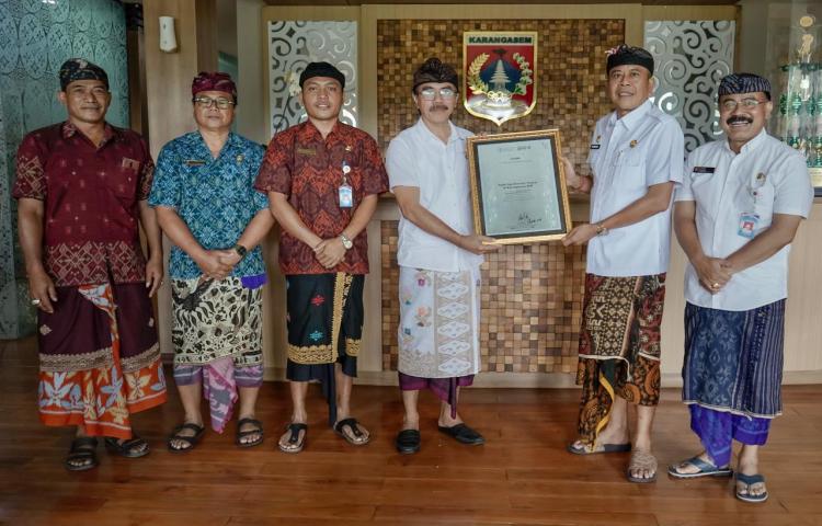 Bupati Karangasem I Gusti Putu Parwata, didampingi Sekda I Ketut Sedana Merta, menerima langsung sertifikat GIAHS, yang diserahkan oleh Bendesa Adat Sibetan Made Mastiawan dan Ketua Kelompok Tani Dukuh Lestari I Nengah Suparta, didampingi Kabid Tanaman Pangan dan Hortikultura (TPH) Dinas Pertanian, Pangan dan Perikanan, I Gusti Lanang Swastika setelah kunjungan dari markas FAO di Roma Italia,bertempat di kantor Bupati Karangasem, Senin (3/11/2025).
