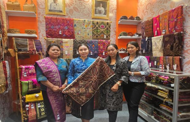 Nyonya Mas Parwata (nomor 2 dari kiri) mengunjungi stand pameran Dekranasda Karangasem yang menampilkan produk tenun khas Karangasem dalam Pembukaan INACRAFT 2025 bersama pelaku IKM Karangasem, I Ketut Seribak (kiri).